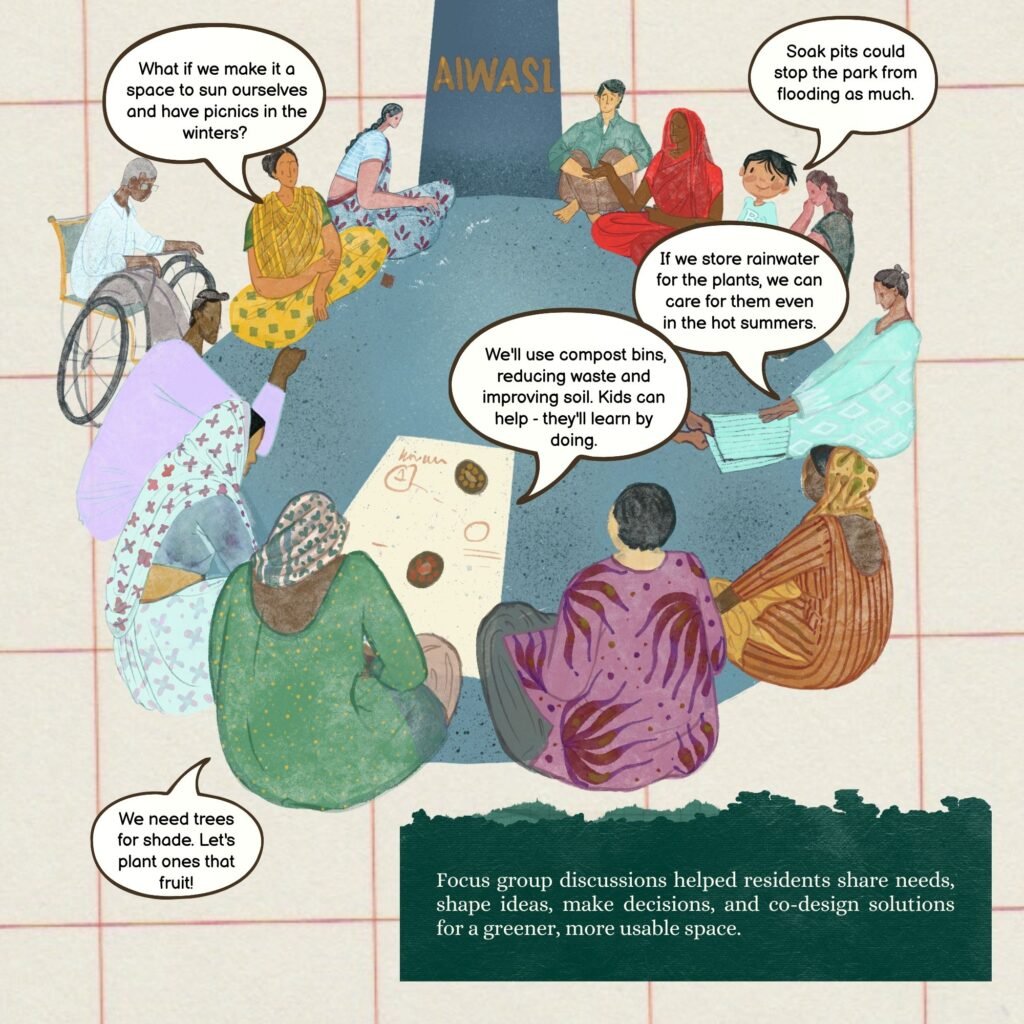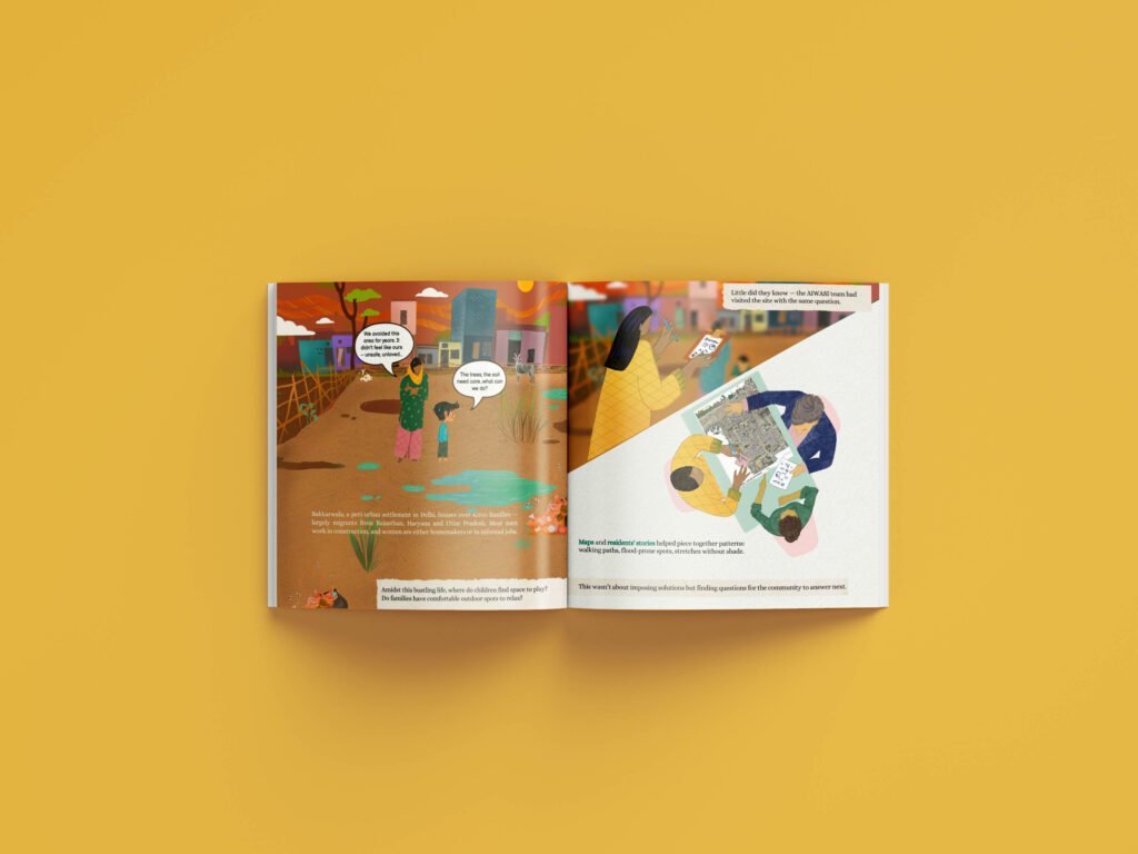 Greening Together is a community-led zine that documents the collective transformation of a neglected urban space into a shared green commons. Created in collaboration with residents, the publication foregrounds lived experience, stewardship, and collective care over extractive or top-down narratives of urban development. Created with residents of Bakkarwala and the AIWASI team that tells the story of how a park was brought to life through community effort.